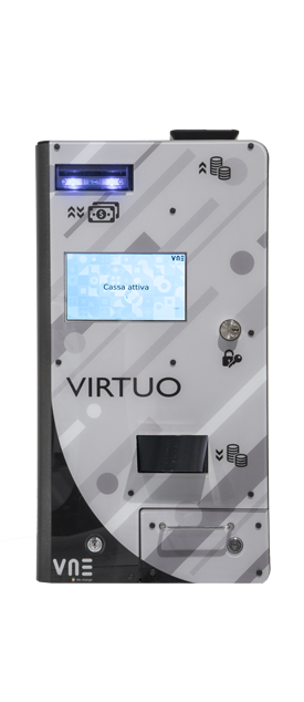 Virtuo es una máquina diseñada para aceptar pagos en efectivo y entregar el cambio automáticamente en cualquier tipo de tienda y servicio público. En su versión básica, se puede conectar a cualquier sistema de gestión presente en la actividad. En la verciòn ADVANCE, es decir, en ausencia de un sistema de gestiòn, serà el mismo Virtuo a administrar la tienda con la option de añadir un impresora de recibo. La máquina está equipada con un sistema de aceptación rápida de monedas que permite al usuario insertar monedas de todo tipo dentro de un compartimento, la máquina las cuenta automáticamente y las inserta en el monedero de cambio, volviéndolo a cargar con cada introducción. También acepta todo tipo de billetes y dos o cuatro de estos (dependiendo del reciclador de billetes elegido) se utilizan para dar el cambio. Este sistema automático de recarga garantiza con poca inmovilización financiera inicial, grandes volúmenes de pagos y cambios. Con los cómodos TV de 7” o la pantalla de dos líneas en la parte frontal, la transacción de pago es fácil e intuitiva para todo tipo de cliente, de esta manera se evita que el operador toque el dinero con sus propias manos. Así que aquí está la primera característica principal de la máquina que es garantizar un nivel de higiene absoluta, especialmente en las actividades donde se venden bebidas y alimentos. Las recaudaciones y los cambios se gestionan con seguridad, evitando que el operador pueda cometer errores o perder el tiempo a causa de la administración del dinero. Al estar conectado en línea con ADSL, la máquina también se puede gestionar y controlar de forma remota, siempre ofreciendo datos significativos sobre el progreso de su actividad en cualquier momento. La apertura de la máquina y de los diversos menús se realiza reconociendo al operador mediante una contraseña. Se pueden prever varios niveles de acceso al menú y a la gestión de la máquina. Virtuo es personalizable en la parte frontal para cualquier necesidad de modo que se pueda integrar con todo tipo de mobiliario. Pequeña, elegante y altamente tecnológica, Virtuo es la máquina adecuada para cada actividad que se preocupa por sus clientes elevando los estándares higiénicos de la actividad y haciendo eficiente la gestión de las colecciones.